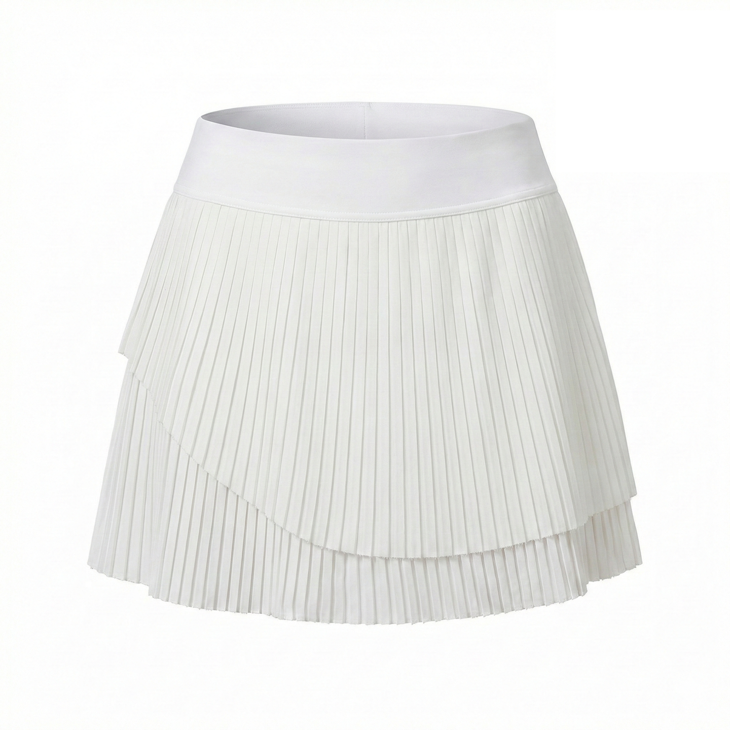 Asymmetric two-layer pleated silhouette with high-rise waistband. Built-in compression shorts with hidden ball pocket. Color-block or solid options.