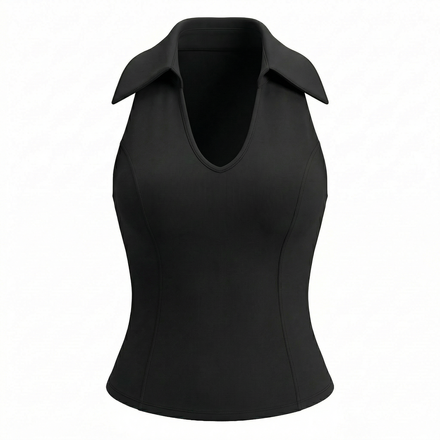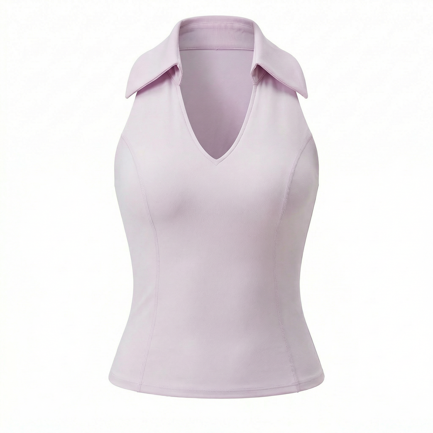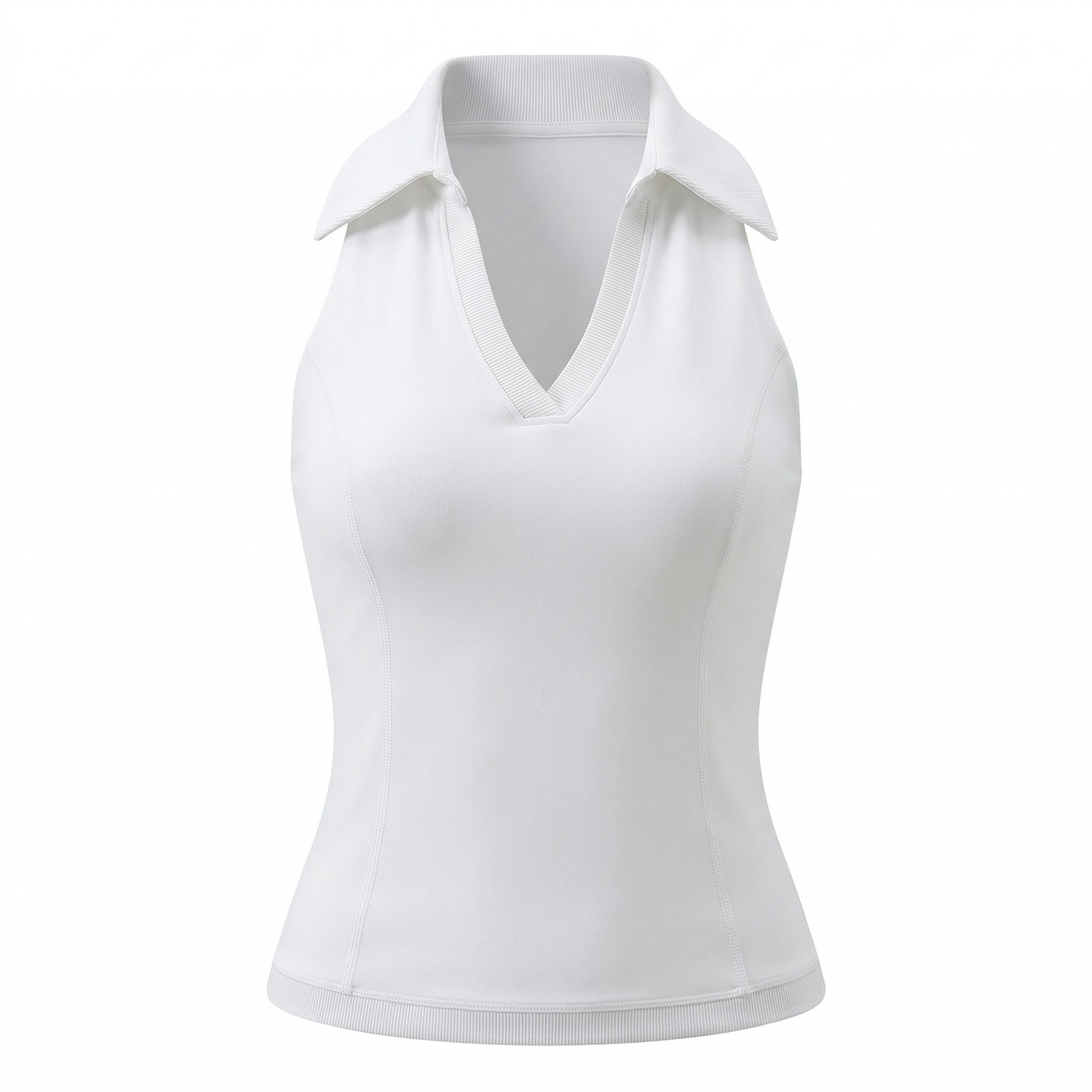 Sleeveless V-neck polo collar with racerback cut for unrestricted shoulder mobility. Integrated breathable bra cups for one-piece convenience. Contrast waist trim accentuates athletic silhouette.