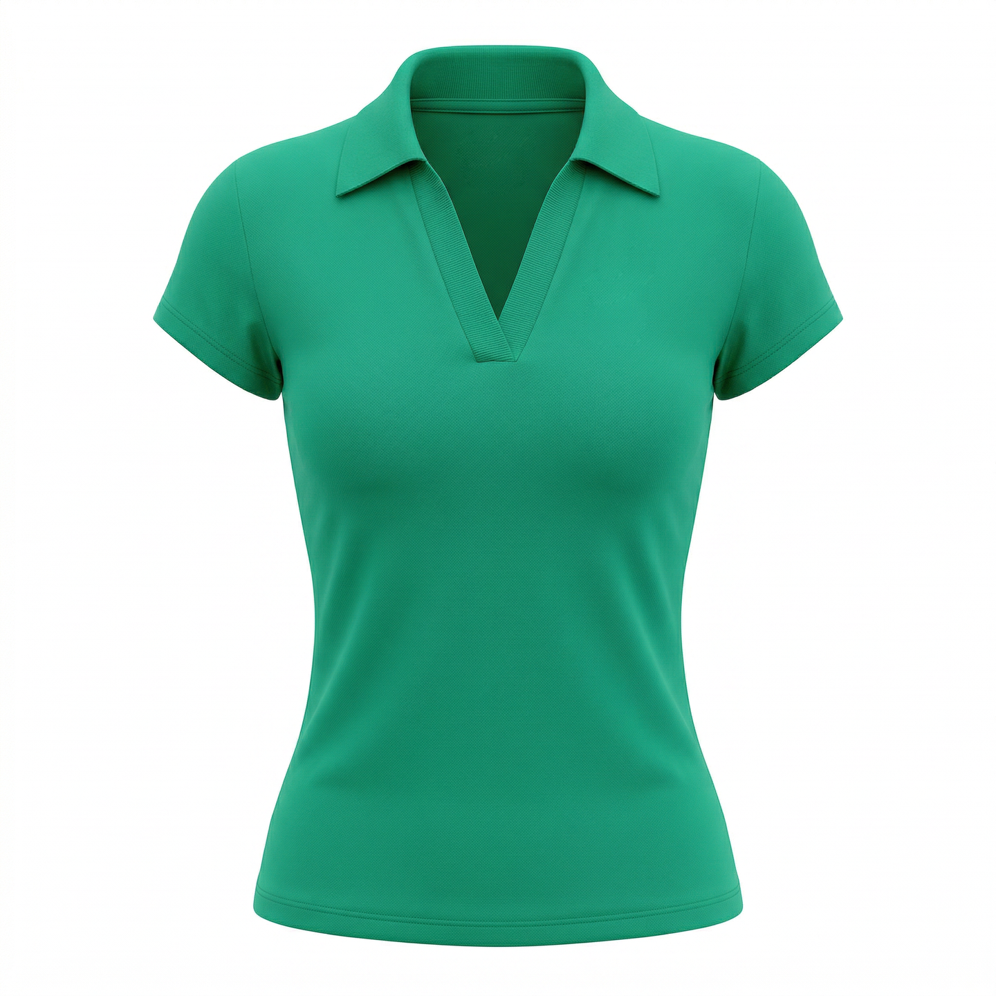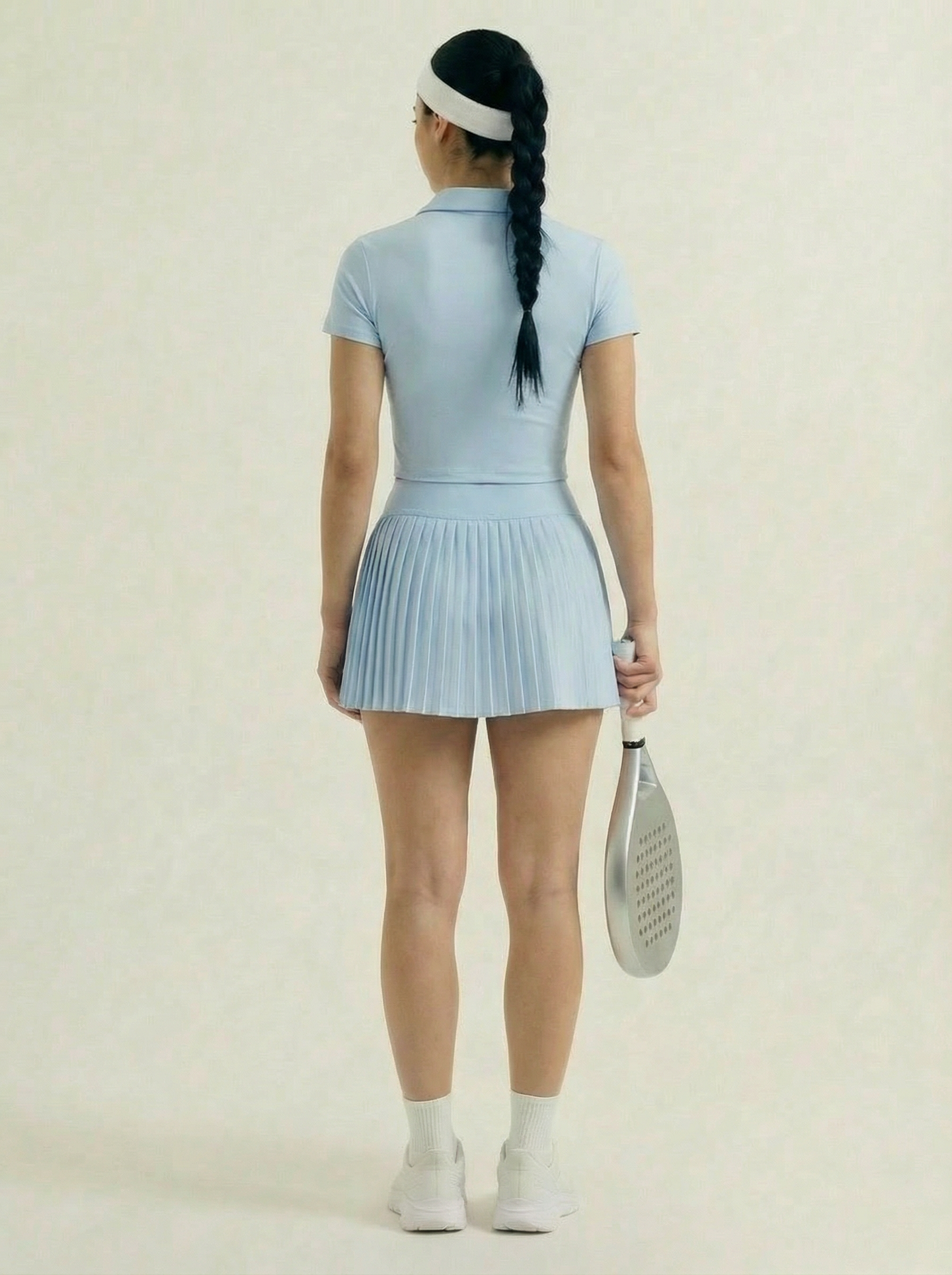 V-neck polo collar visually elongates the neck line. Short sleeves with slim fit silhouette engineered for agile court movement. Clean, minimal styling with subtle tailoring for a flattering athletic aesthetic.