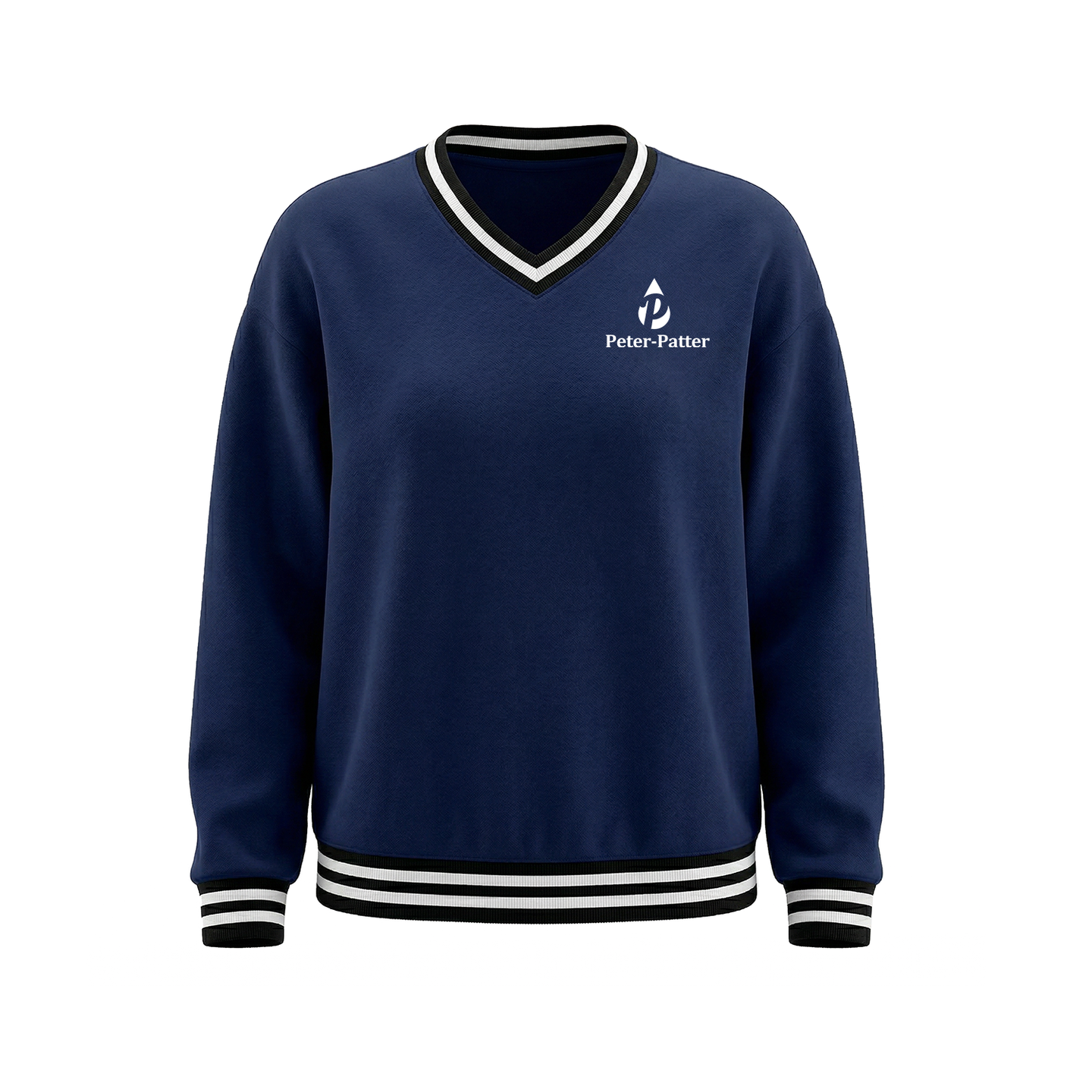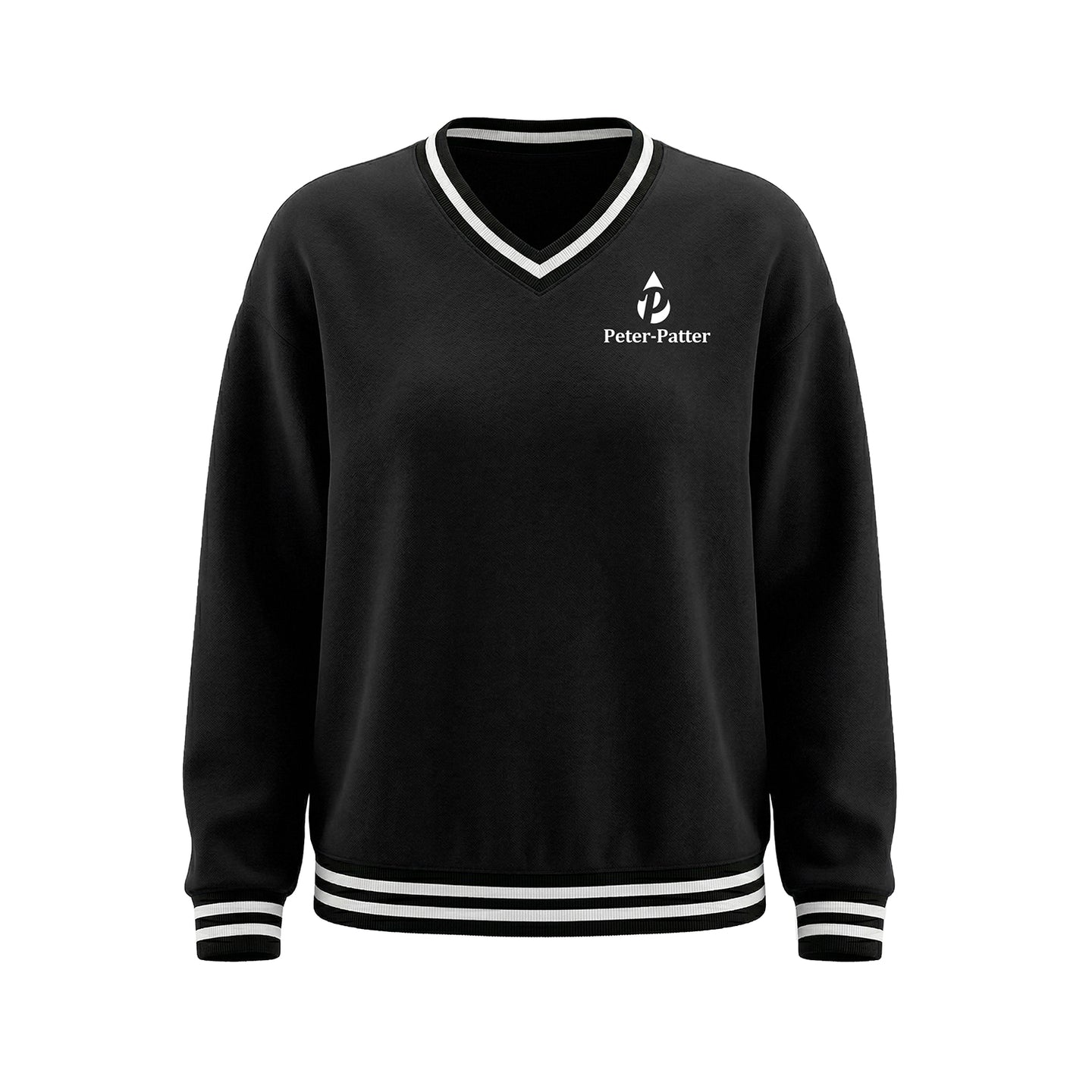 Striped V-neck ribbed collar with drop-shoulder silhouette. Relaxed fit engineered for effortless movement on court. Tennis racket embroidery at left chest. Contrast striped ribbing at cuffs and hem for classic athletic aesthetic.