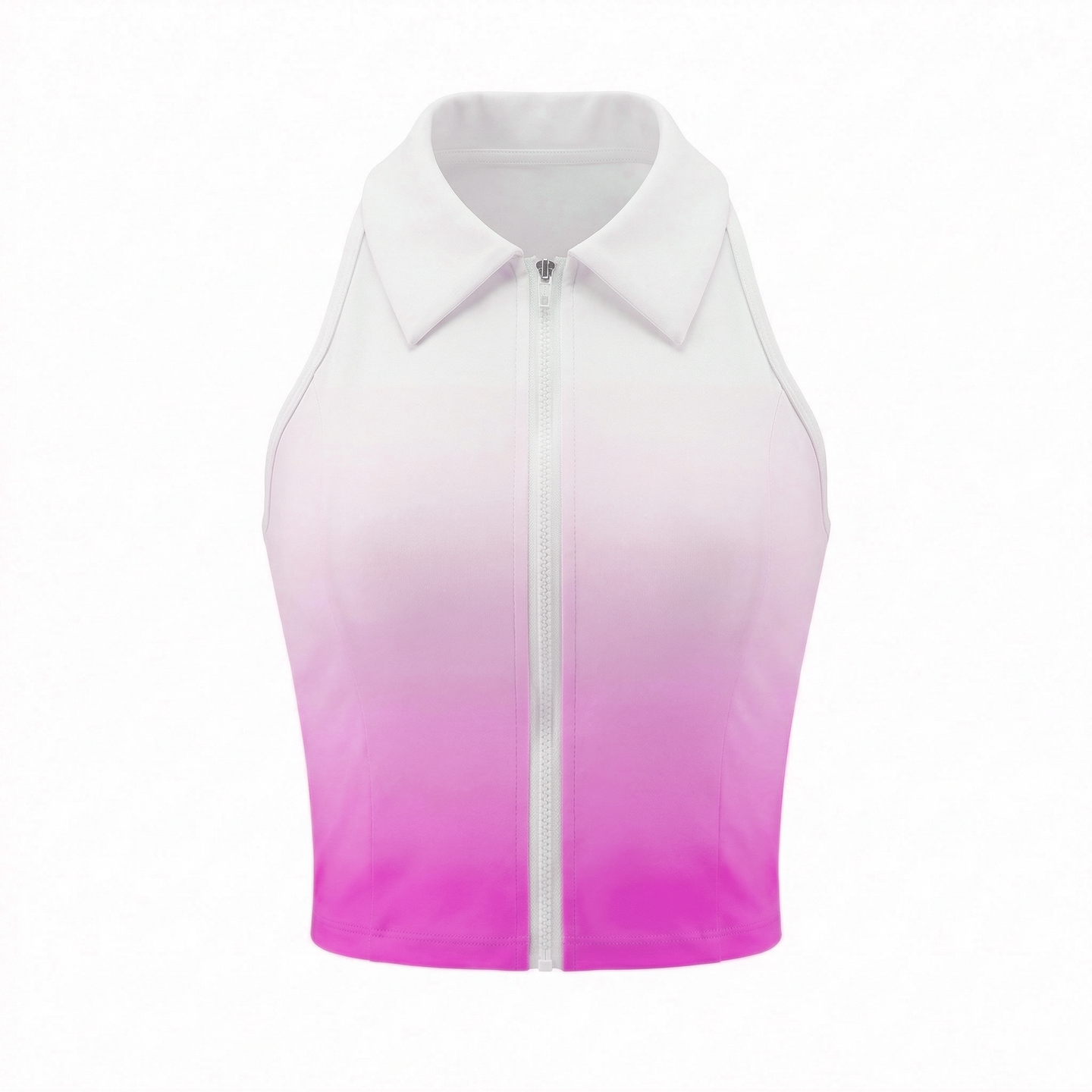 Halter polo collar with front zipper for easy on/off. Racerback design allows full shoulder rotation for powerful smashes. Built-in bra cups provide secure support without shifting. Cropped length pairs perfectly with high-waisted skirts.